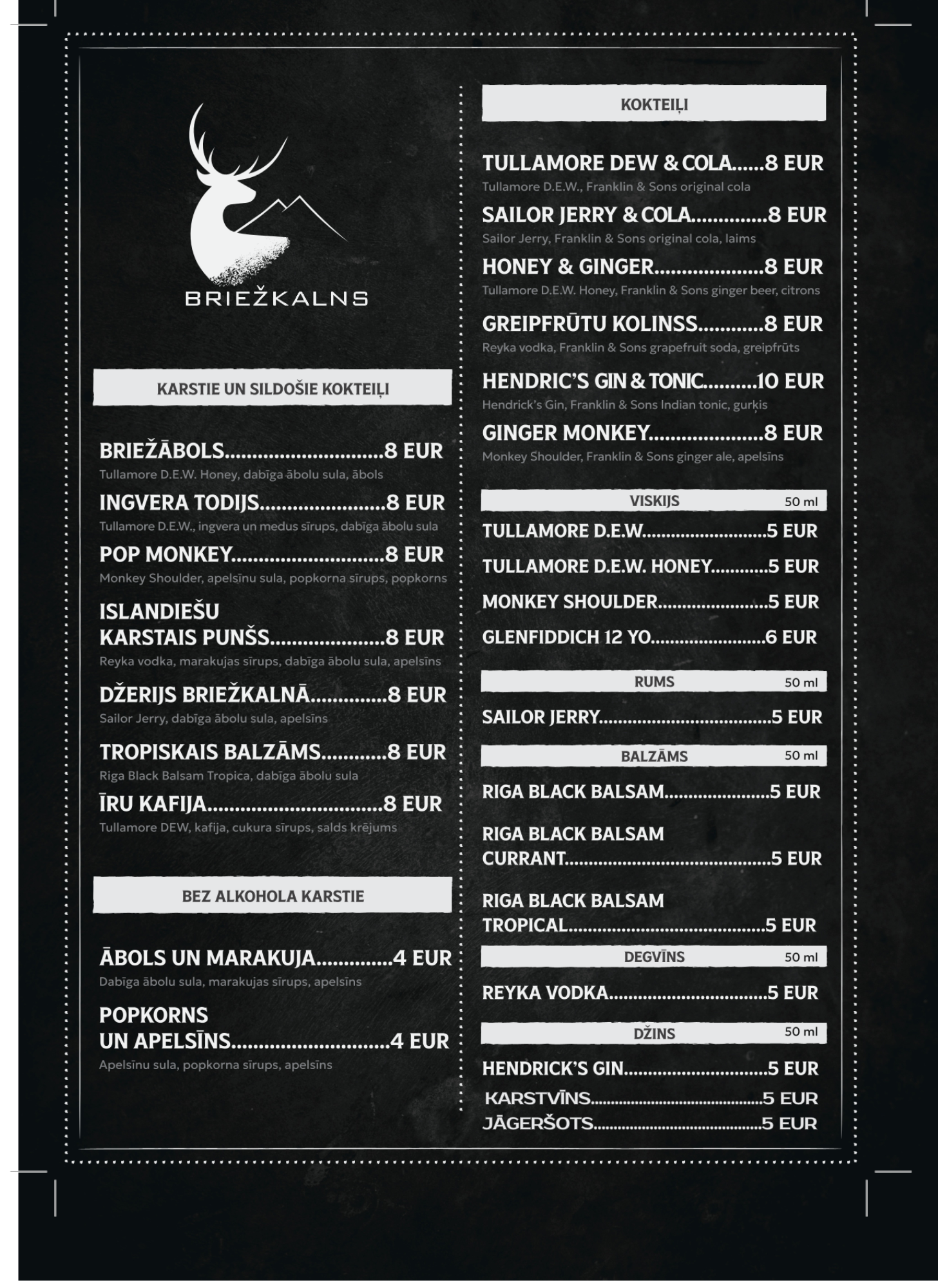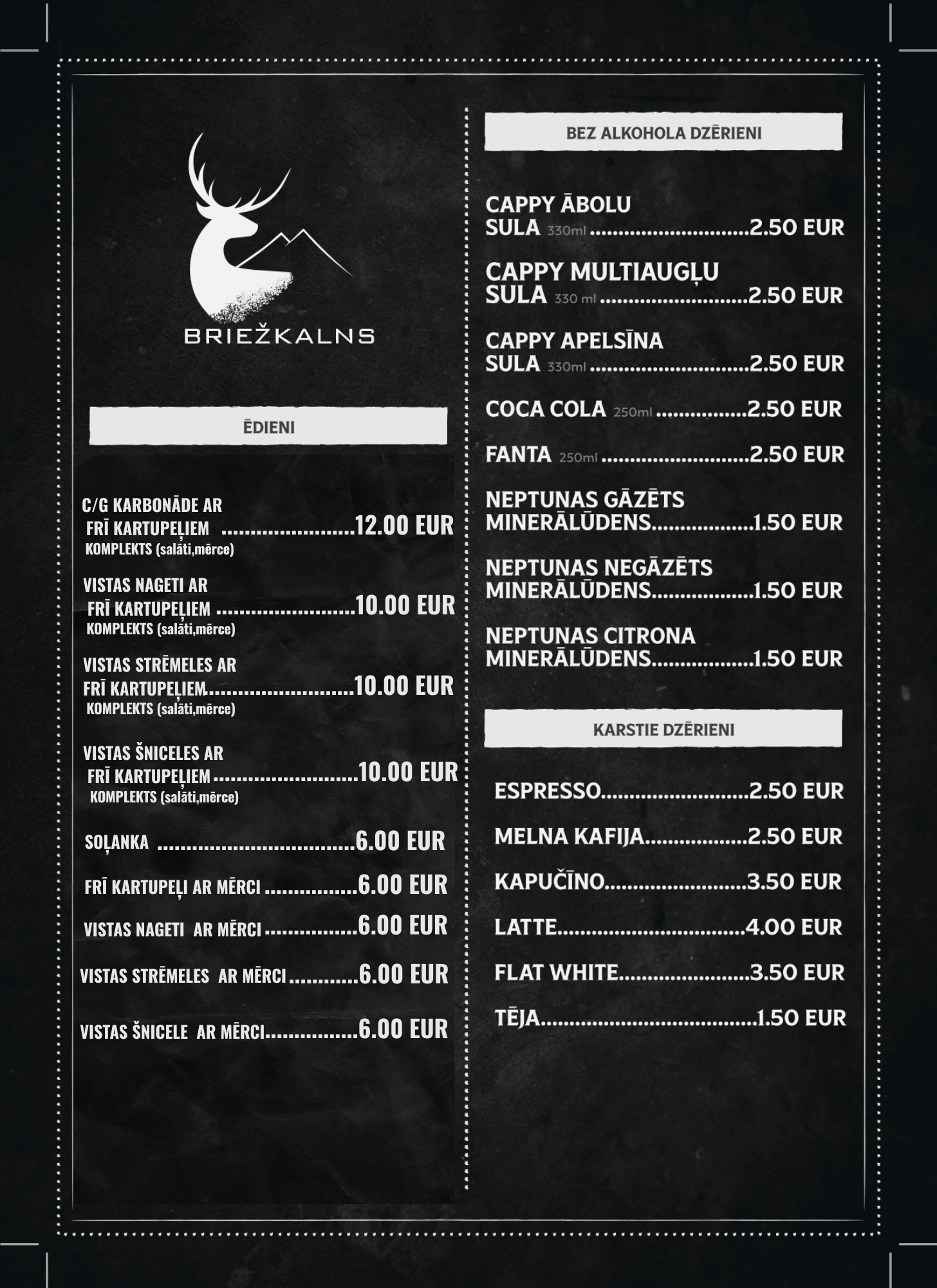 Mūsu ēdienkartē atradīsiet : cūkgaļas karbonādes un vistas strēmelītes, “Briežkalna” kartupelīšus, frī kartupeļus, nagetus un daudz ko citu.